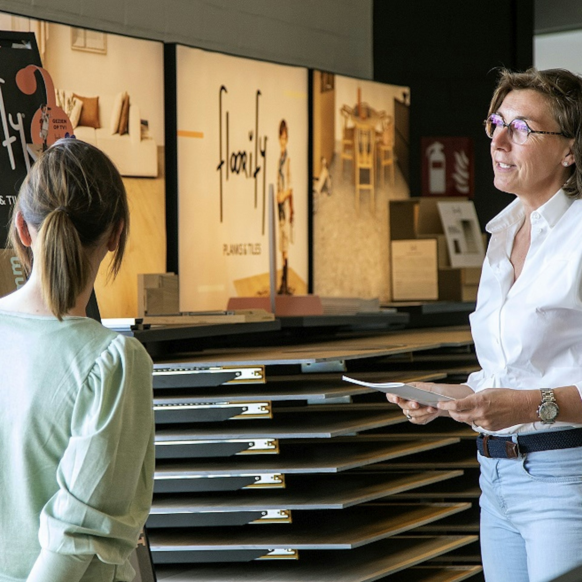 Bij Van den Braembussche in Eeklo kun je de verschillende Floorify-vloeren bekijken. De stalenborden laten je de unieke texturen en kleuren van de vloeren in real-life ervaren. Dit helpt je om een helder beeld te krijgen van hoe de vloer eruit zal zien in jouw eigen woning en hoe deze zich verhoudt tot je interieur.