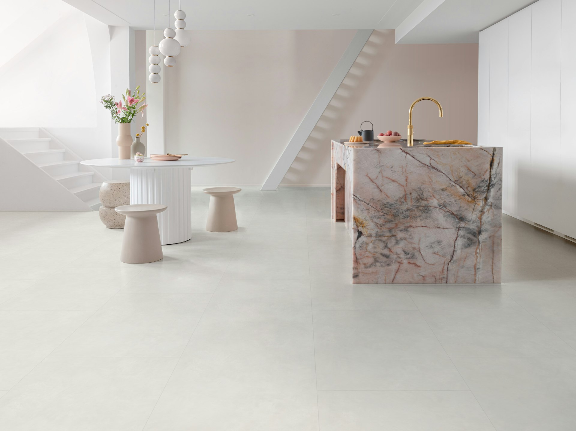 Floorify rigide vinyl vloeren zijn waterbestendig. Niet een beetje, maar helemaal. Laat je leefruimte, badkamer en slaapkamer naadloos in elkaar vloeien: Floorify is overal thuis.